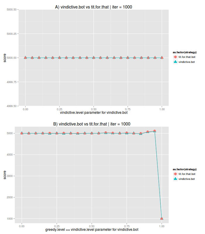 Using different thresholds of vindictive.level in a vindictive.bot vs tit.for.tat.bot. A) We can see that the vindictive.bot does not "defect" unless provoked. Therefore as these bots "cooperate" along all the simulations, they get the score for 5000 which is the maximum score for mutual cooperation along 1000 iterations. B) For this experiment, we are increasing the greedy.level and the vindictive.level by steps of 0.05. The greedy.level in the vindictive.bot only determines the probability to "defect" in the first move only and only if the vindictive.bot is playing as player.1. We can see that the tit.for.tat.bot handles very well when this bot increases its greediness and the vindictiveness. This bot cooperates when the adversary cooperates, but reacts when the other player decides to "defects"