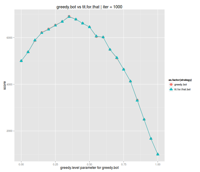 Using different thresholds of greediness in a greedy.bot vs tit.for.tat.bot. we can see that the tit.for.tat.bot handles very well when this bot increases its greediness. this bot cooperates when the adversary cooperates, but reacts when the other player decides to "defects"