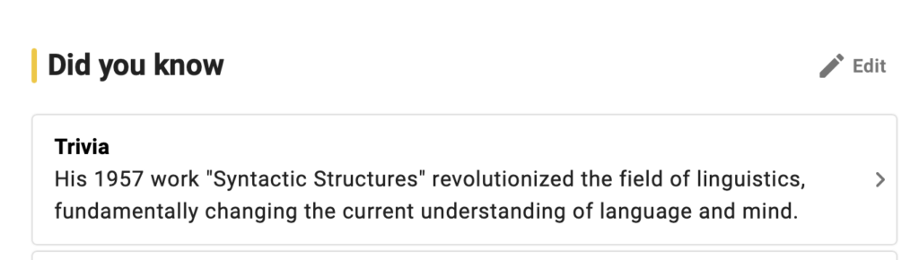 And . . . Noam Chomsky. He has an Erdos number of 4, a Bacon number of 2, and an Epstein number of 1, so a total of 7. And Noam is still active! With some effort maybe he could find the right collaborator and get his Erdos number down to 3 and have an Erdos-Bacon-Epstein number of 6.