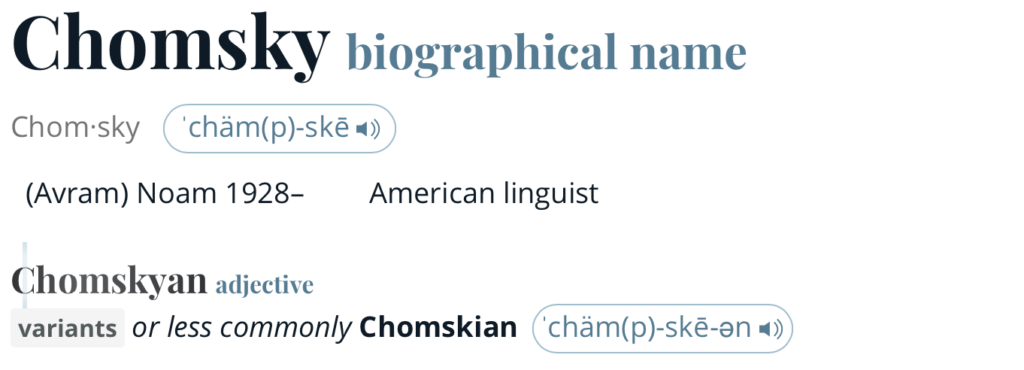 Since we’re on the topic, no citations from Noam Chomsky either (not even for “colorless”? C’mon, Merriam-Webster, you can do this!), but he’s got us one better as he’s an actual dictionary word: