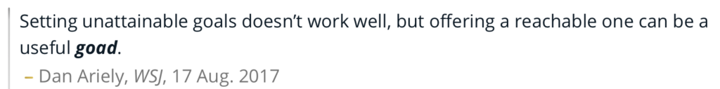 I think, from Ariely’s perspective the unattainable goal was to make an actual discovery in psychology; the attainable goal was to get some LEGAL TENDER by working with people’s SOCIAL expectations, maybe not OPTIMAL from my perspective as I think of belief in such claims as a FALLACY and they GOAD me into spending my time in what are ultimately less than OPTIMAL pursuits.