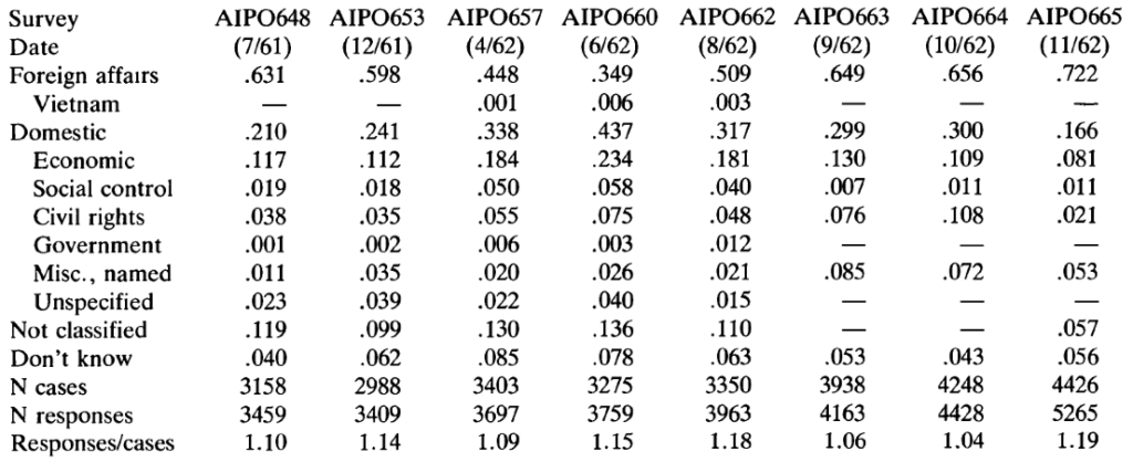 Listed fourteenth, huh? I couldn’t easily find the relevant Gallup report online, but I was able to access this 1985 article, “The Polls: America’s Most Important Problems Part I: National and International,” by Tom Smith, which reports that Gallup started asking that question back in 1935! Here’s the data summary from 1962: