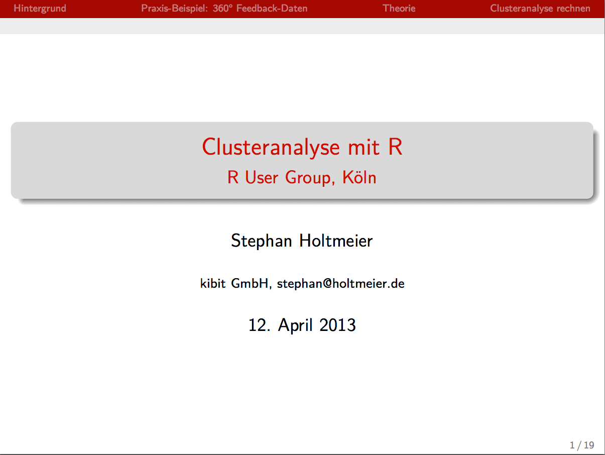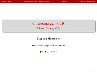 Stephan Holtmeier: Cluster Analysis with R For more information on cluster analysis functions in R see also the cluster task view on CRAN. If you would like to get an overview of how psychologists look at data, then check out William Revelle's vignette of the psych package. Finally, if you are interested in how a k-means cluster analysis can be used for image manipulation, see an earlier post of mine. Next Kölner R meeting, 19 July 2013