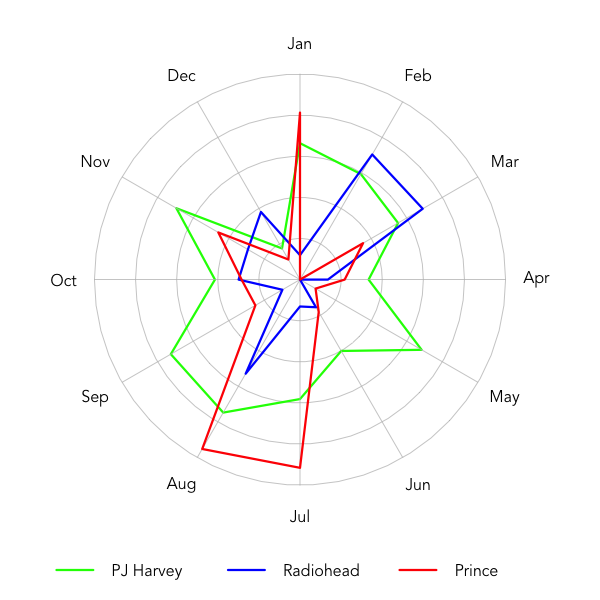 What we get is a radial plot showing how much plays an artist gets in a specific month. And indeed, it looks like I'm listening to Radiohead more in "darker" months like in February and March - but also in August.