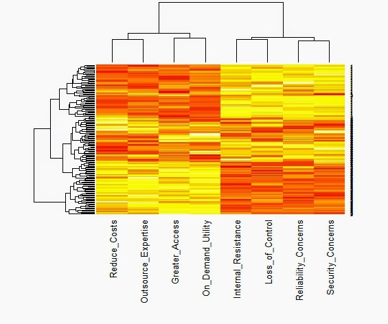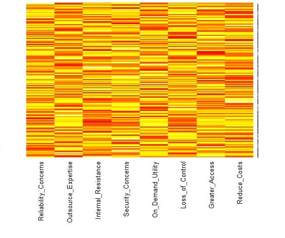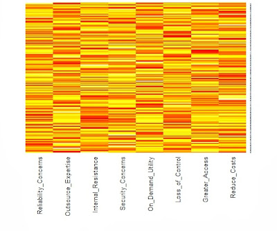 We typically start with the data matrix, a rectangular array of rows and columns. If we type its name on the R command line, it will show itself. But the data matrix is hard to read, even when there are not many rows or columns. The heat map is a visual alternative. All you need is the R function heatmap( ) from stats, and the data matrix structure will be displayed in black and white, shades of gray, or bright color schemes. However, you will need to know what you are looking for and how to display it. As Wilkinson and Friendly note in their American Statistician paper on The History of the Cluster Heat Map, "a heat map is a visual reflection of a statistical model." Consequently, the unordered data matrix and its accompanying heat map provide little assistance when searching for structure. Nor will any reordering do, only one that reflects the data generation process. The underlying pattern in the data is discoverable only when we have rearranged the rows and columns in a manner consistent with the processes that produced our data in first place. Jacques Bertin is a bit more poetic, "A graphic is not 'drawn' once and for all; it is 'constructed' and reconstructed until it reveals all the relationships constituted by the interplay of the data." To get more specific, let us look at a heat map from a simulated data matrix with 150 respondents rating on a nine-point scale how much they agreed with each of eight attitude statements measuring their willingness to adopt cloud computing technology. This is cluster heat map with yellow indicating higher agreement and red showing the lower end of the same scale. Both the rows and the columns have been ordered by separate hierarchical cluster analyses. It appears that the columns are divided between the four positive attitudes toward cloud computing on the left and the four negative statements on the right. The rows are also ordered. The first 50 respondents give cloud computing a "thumbs-down" by endorsing the negative statements and rejecting the positive ones. The reverse is true for the last 50 respondents. Those in middle are redder than the other respondents, suggesting that they might be more ambivalent or simply less informed. It seems that the heat map can reveal the presence of well-separated clusters when we reorder the rows and columns to reflect that clustering. Here is the same heat map with random sorting of the rows and columns. The difference between these two heat maps is not that one is ordered and the other is not. There are forces at work in the data matrix creating differences across both the respondents (rows) and the variables (columns). The row dendrogram works because we have three clusters or segments of respondents, each with a unique pattern of attitude ratings. Similarly, the factor structure underlying the eight ratings is mirrored in the column dendrogram. Little would have been revealed had the sorting not been based on a statistical model that captured these forces. Perhaps it would help if we looked at another example with a different underlying structure. Below, Wilkinson and Friendly show a binary data matrix display with several different settlements as the rows. They have noted when each settlement offered each of the functions listed in the columns by darkening the cell. Because the rows and columns have been sorted or reordered, we can clearly see the underlying pattern. The settlements with the most functions were reordered to be located near the top of the table. Similarly, the functions were sorted so that the least frequent ones were positioned toward the right hand side of the table. Black and white cells were used rather than the numbers zero and one, but the same pattern would be revealed regardless of how we represented presence or absence. The numbers next to each settlement name indicate the population in thousands, but this information was not used to reorder the matrix.