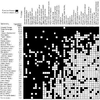 The pattern that we observe is known as the Guttman Scalogram. That is, the columns have been arranged in ascending order so the presence of a function at a higher level implies the presence of all the functions at lower levels. Item response theory (IRT) can be derived as a probabilistic generalization of this unidimensional model describing the relationship between the rows and columns of a data matrix. It is a cumulative model, as can be clearly seen from the above visualization. All the settlements provide the same few basic functions, and functions tended to added on in a relatively fixed order as one moves up the data table.