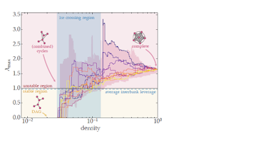 Instead, Bardoscia and colleagues study how gradual changes in the interconnection pathways in the network can create mechanisms that tend to amplify small disturbances, rather than dampening them away. For example, the figure below illustrates how the network goes from being stable to unstable just due to gradual diversification, normally thought of as beneficial for risk management. It shows a network eigenvalue λmaxreflecting whether the propagation dynamics of the network dampen (λmax < 1) or amplify (λmax > 1) small disturbances. The researchers used the balance sheets of the top 50 listed banks in the European Union as a starting point, and then simulated a process in which banks gradually increase the degree of diversifi cation by creating further exposures towards additional counterparties. They carefully rebalanced the network at each stage to keep the assets and liabilities consistent with the original balance sheets and the interbank leverages of all banks fixed. As the degree of diversi fication increases, a bank's exposures spread out across ever more counterparties. Even though the total interbank exposure of each bank remains constant, the banking system eventually goes unstable, and it doesn't even take a lot of diversification to make it happen. As the figure shows, instability first arises when contracts link together just 3% of all the possible pairs that could in principle be linked.