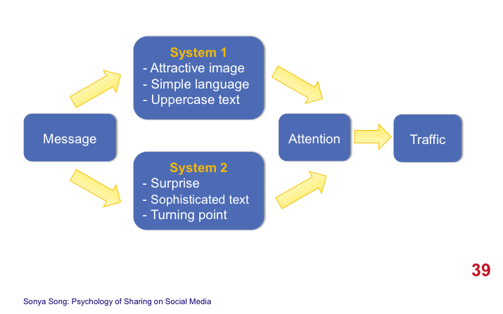 Figure 11: How to attract System 1 and System 2 for higher traffic To sum up, there are various ways to attract attention on social media. Beautiful photos, simple messages and uppercase words likely attract System 1 for some unconscious attention. To attract more conscious and meaningful attention, we can address surprises, sophisticated language, and turning points in our messages. Both approaches would help again more attention and thus more traffic on social media (see Figure 11). Some may say these approaches are deceitful. I believe, however, the judgment hinges on the goal. If our goal is as sincere as to reach out to a larger audience and increase the civic impact of a newsroom, the use of these techniques is justified and appropriate. Here I want to quote Kahneman’s thought on this: All this is very good advice, but we should not get carried away. High-quality paper, bright colors, and rhyming or simple language will not be much help if your message is obviously nonsensical, or if it contradicts facts that your audience knows to be true. The psychologists who do these experiments do not believe that people are stupid or infinitely gullible. What psychologists do believe is that all of us live much of our life guided by the impressions of System 1…—How to write a persuasive messageDaniel Kahneman (2011, p. 64)