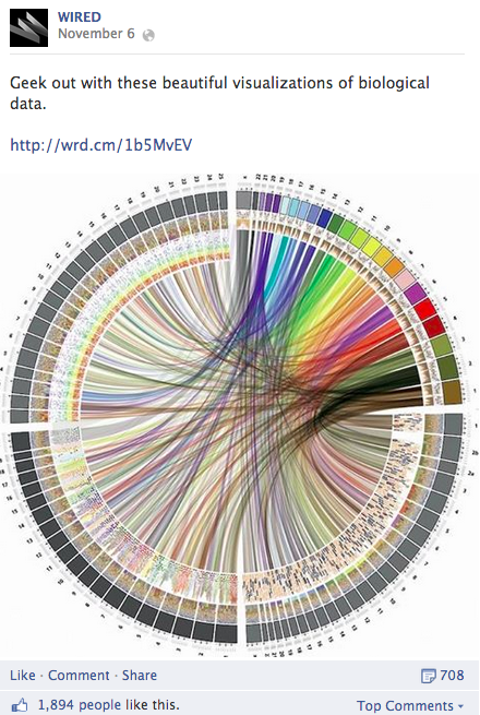 Besides maintaining relations with others, people also tend to improve and mange their presence in social life. Goffman (1959) compares everyday life to theatrical performance; in both scenarios people recognize a specific setting and present themselves in front of a known audience. Not only through face-to-face interactions, people also attempt to build ideal self-images by associating themselves with tangible objects, such as branded goods. As Thompson and Hirschman note: “Consumption serves to produce a desired self through the images and styles conveyed through one’s possessions” (1995, p. 151). Similar phenomena have also been observed on the Internet. For example, personal website owners may follow a motto that “we are what we post”, because they can manage their online self-images by presenting brand logos and products at whim, as opposed to a real life with financial constraints (Schau & Gilly, 2003). On dating websites, people get fairly cautious because profiles and photos are often carefully selected if not completely misleading. We have also heard that teens are obsessed with and exhausted by frequent improvements of their online presence. Similarly, we suspect that Facebook Pages (brands, celebrities, news media, etc.) are also used to craft and improve people’s online presence, or an ideal self-image. On social media, “I share therefore I am”. The news stories curated and shared by Facebook users inevitably signal their ideal self-images as well. Take Wired as an example, it frequently “geeks out” its fans. Complex circuits and charts are often highly shared, as shown in the following screenshots. I believe Wired has a high-tech audience, but still these “geeky” stories can be curated by non-technical readers as decorations.