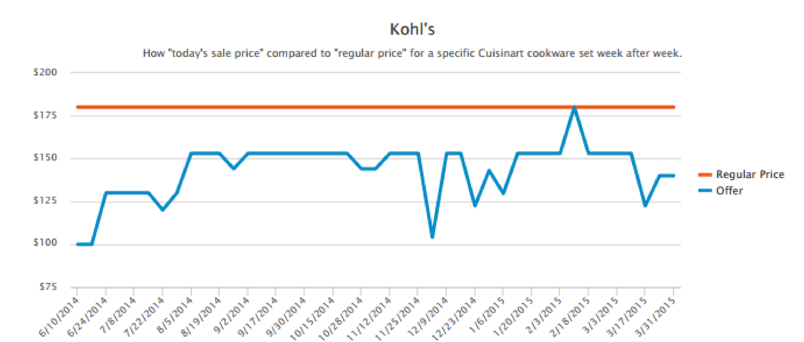 Le sued under various state consumer protection statutes (and unjust enrichment), alleging that Kohls falsely advertised “sale” or “discount” prices off of the “regular” or “original” item prices, which were not in fact regular. As a graph from Consumers’ Checkbook/Center for the Study of Services, an independent, nonprofit consumer organization, indicates, “at Kohl’s, the sales often never end”: