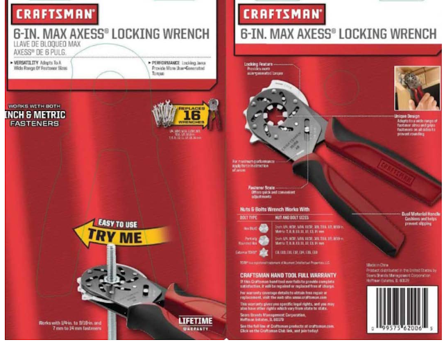 In DTC ads for the MALW, Sears stated: “[i]f you want maximum versatility in a single wrench, then you’ll love the latest innovation from Craftsman, the Max Axess Locking Wrench.” The product packaging for the MALW shows a picture of the wrench, the term “Unique Design,” and, underneath that, the phrase “Adapts to a wide range of fastener sizes and grips fasteners on all sides to prevent rounding.” The packaging also contains a dotted line going from the writing to the picture of the wrench. Sears issued a press release with similar claims.