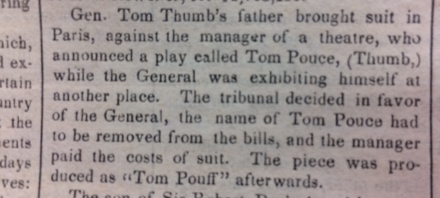 From The Spirit of the Times, May 21, 1845 "Gen. Tom Thumb's father brought suit in Paris, against the manager of a theatre, who announced a play called Tom Pouce, (Thumb,) while the General was exhibiting himself at another place. The tribunal decided in favor of the General, the name of Tom Pouce had to be removed from the bills, and the manager paid the costs of suit. The piece was produced as 'Tom Pouff' afterwards." H/T Zach Schrag