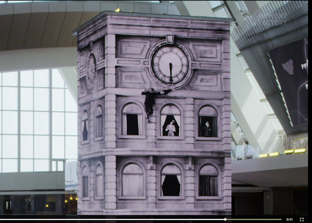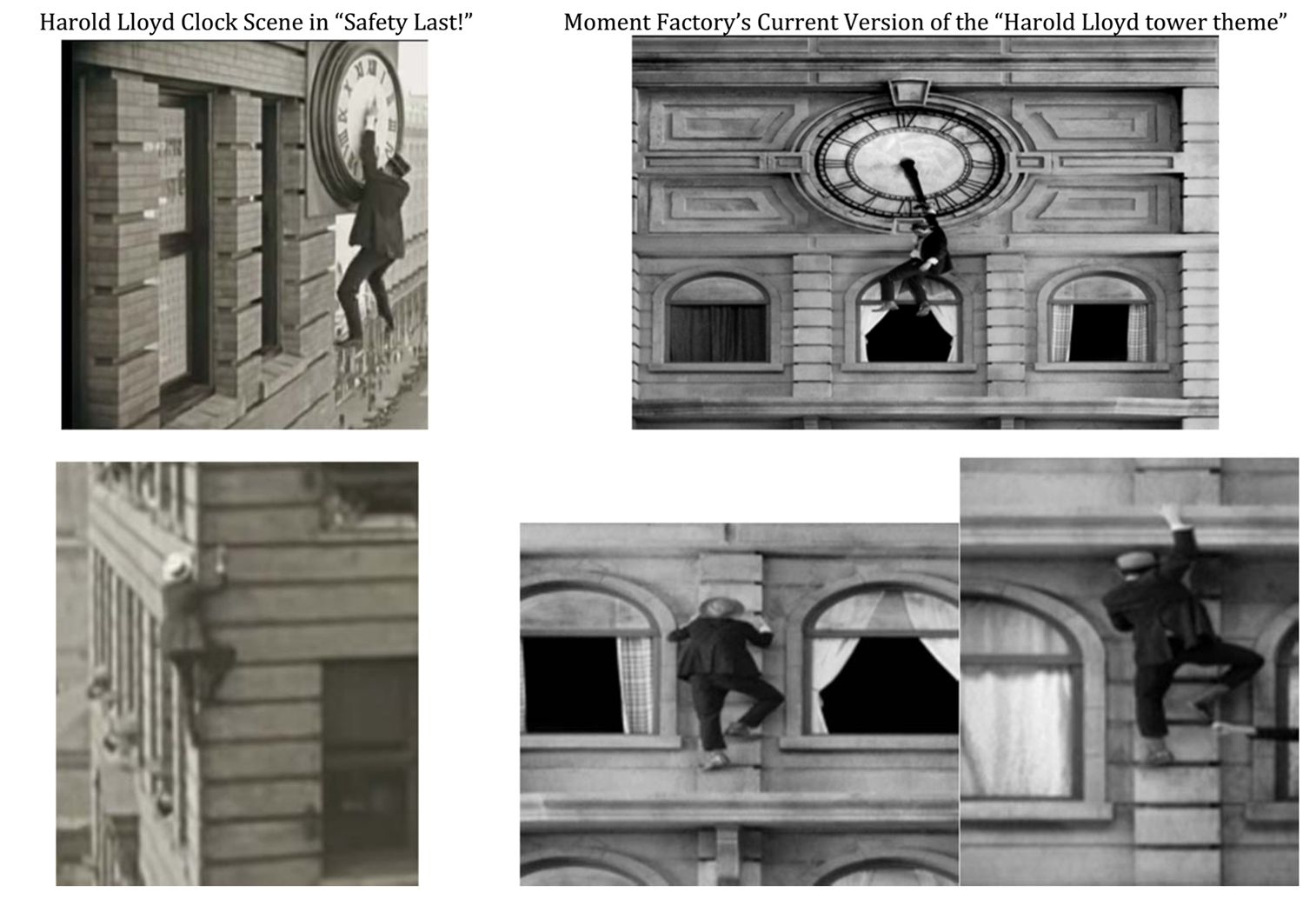 screenshot from video of installation The Time Tower video is 87 minutes long, with 14 distinct segments. One segment is “Silent Movie,” lasting nearly three minutes; it features a man climbing a building past various characters, “including a knight in shining armor, a monster reading a newspaper, a conductor and a socialite.” As part of various shenanigans, the climbing man grabs the hands of a clock that is on the outside of the building, and hangs from them for about 10 seconds. The scene was allegedly called the “Harold Lloyd tower theme” in pre-production stills. HLE alleged that numerous consumers were expressly and explicitly deceived and confused into believing that Moment’s products and/or services were affiliated with Harold Lloyd and HLE.