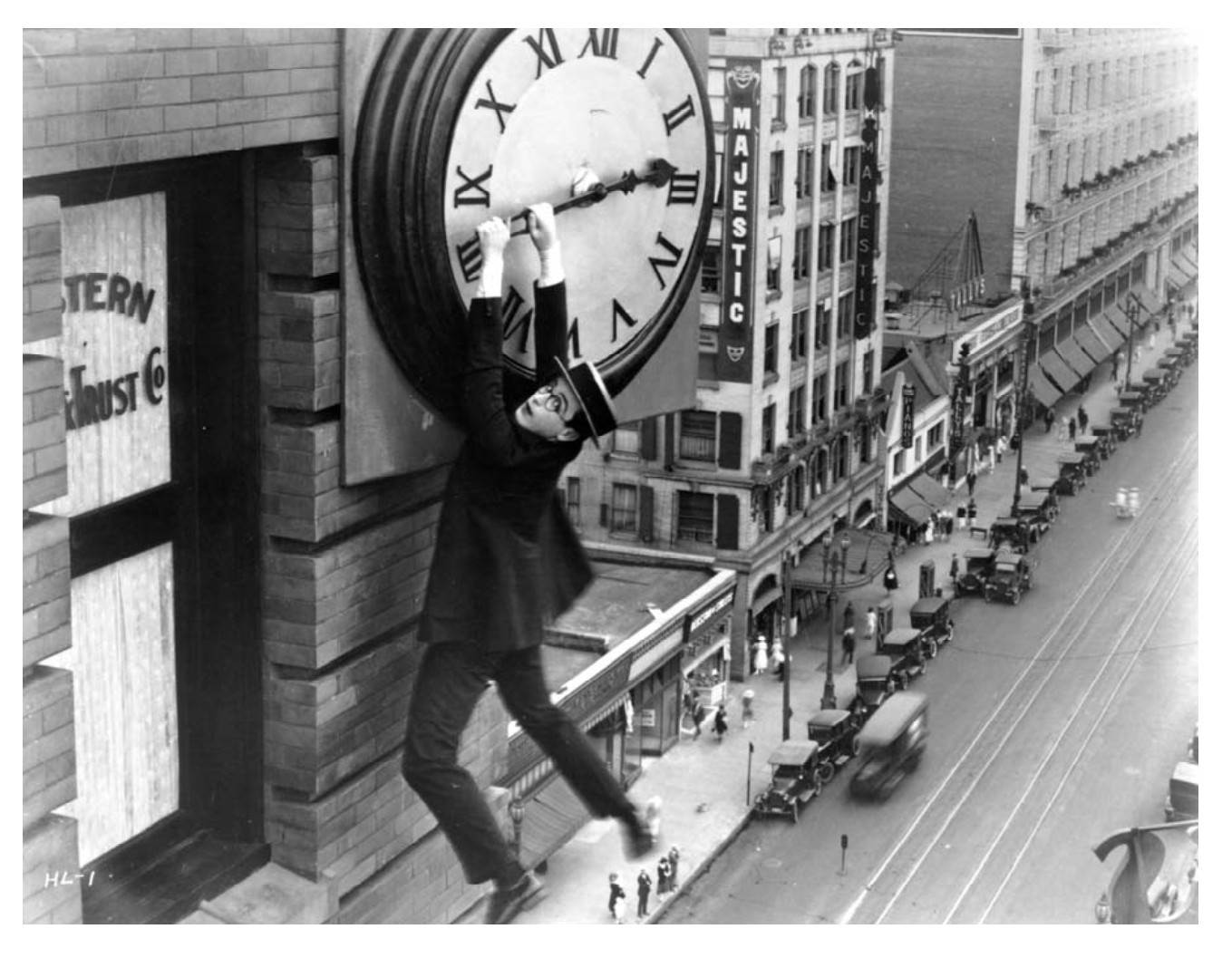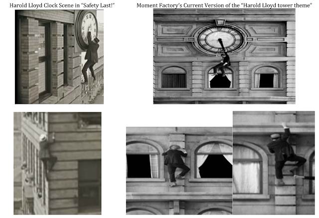 HLE sued Moment for copyright infringement and false designation of origin based on HLE’s copyright in the 1923 silent film Safety Last, starring Harold Lloyd. “The film’s closing scene features its principal character, played by Harold Lloyd, dangling from the hands of a large clock.” Moment’s multimedia work, the “Time Tower,” included a video of a man dangling from the hands of a large clock. The final chase/climb scene in Safety Last is about seven minutes long; Lloyd dangles from the clock for about a minute. HLE licensed the Clock Scene for use the films Back to the Futureand Hugo for scenes in which a character dangled from the hands of large clock.