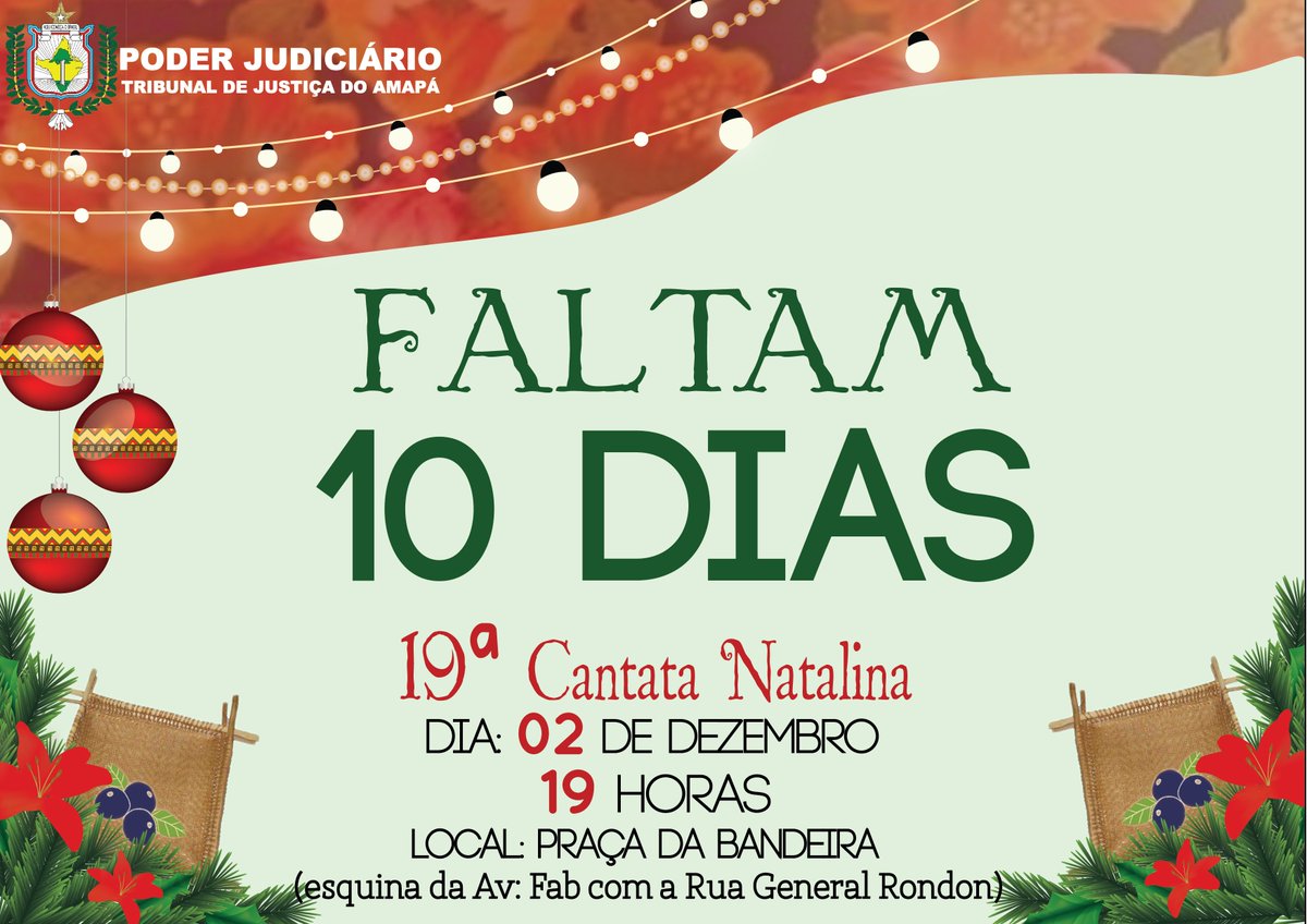Contagem regressiva. Faltam 10 dias para a 19ª Cantata Natalina do Coral da Justiça do Amapá. Você e sua família são nossos convidados de honra! pic.twitter.com/NUICbYg5G9