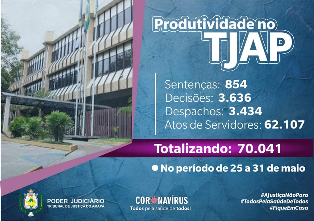 Produtividade no TJAP: Justiça do Amapá registra mais de 70 mil movimentações processuais de 25 a 31 de maio https://bit.ly/2MgkK5h  pic.twitter.com/bSPEZ4qgNW