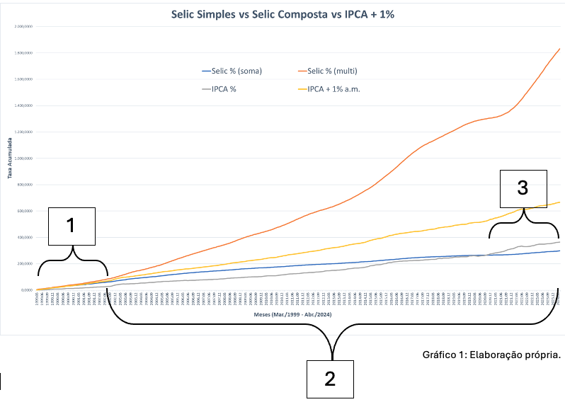 Para fins comparativos, o Gráfico 1 também indicava, em laranja, sob a rubrica de “Selic (multi)”, a taxa juros com capitalização composta que remunera a dívida pública mobiliária brasileira; isto é, a taxa Selic determinada pelo COPOM. Nesse caso, a capitalização dependeria da “multiplicação” dos percentuais de juros mensais incidentes sobre dívida durante o período da mora.