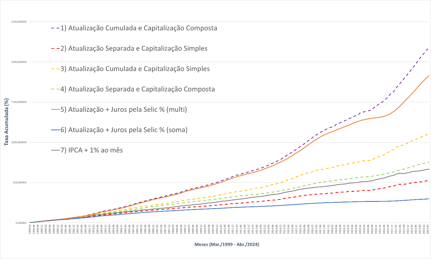 - O critério de atualização cumulada e capitalização simples (linha amarela, número 3), assim como o critério de atualização separada e capitalização composta (linha verde, número 4), ficam acima da tese vencida no STJ (linha cinza, número 7).