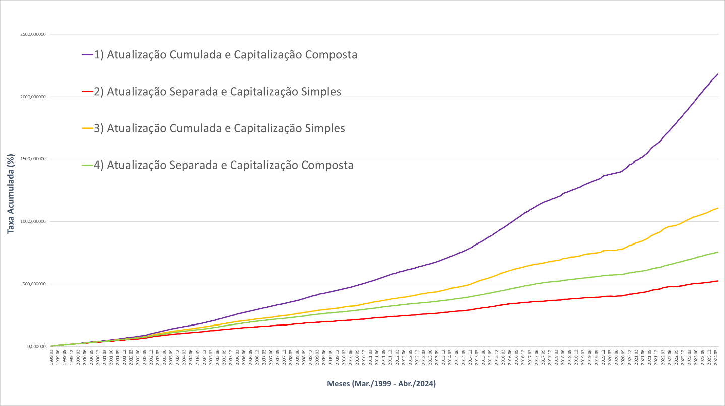 Para visualizarmos a diferença prática, podemos aplicar esses quatro critérios para o período de março de 1999 a abril de 2024. Vejamos o Gráfico 2, no qual eixo vertical indica a taxa acumulada referente aos encargos da mora, incluindo juros e atualização monetária, que seria aplicada ao principal da dívida caso fosse paga em cada mês discriminado no eixo horizontal: