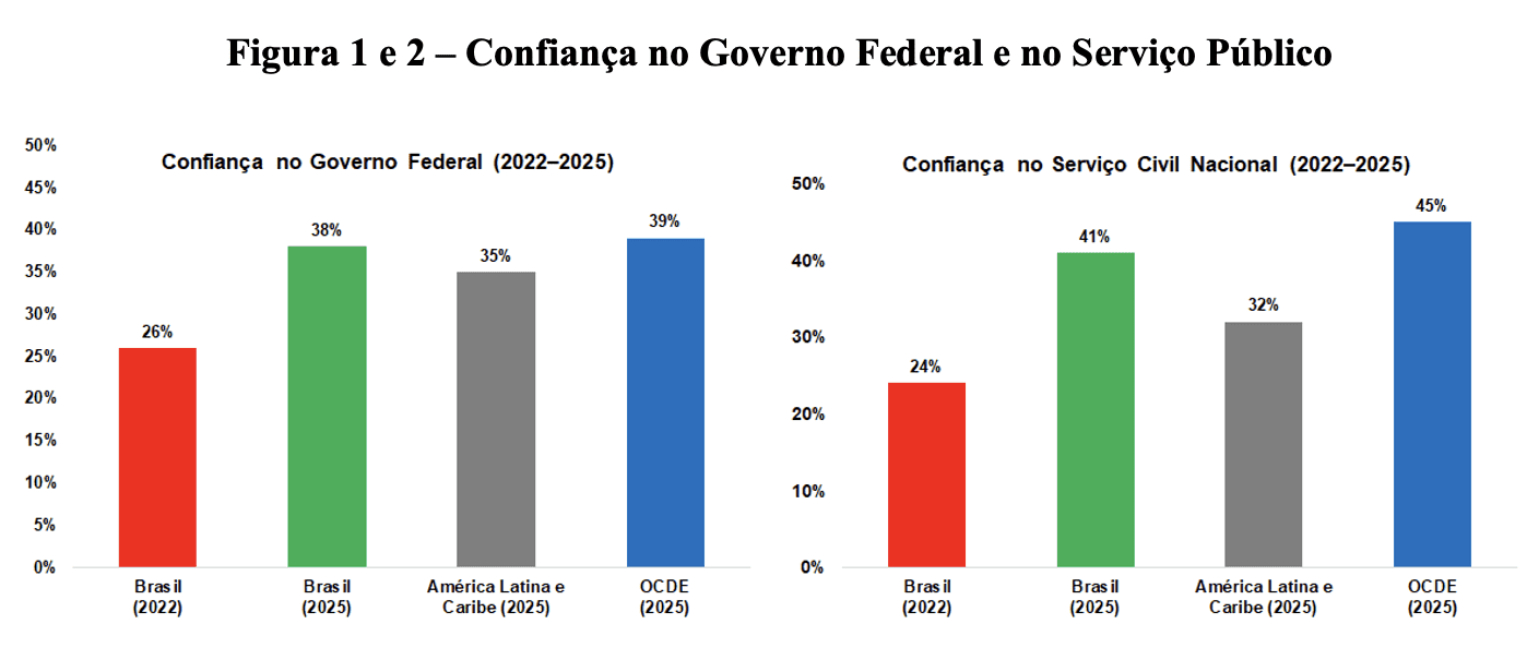 Como ilustrado nas figuras a seguir, a parcela da população brasileira que declara confiança moderada ou alta no governo federal passou de 26% em 2022 para 38% em 2025, avanço expressivo que posiciona o país acima da média da América Latina e Caribe (35%) e relativamente próximo da média da OCDE (39%).