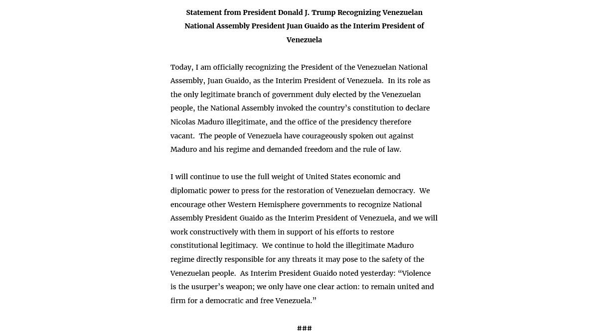 The citizens of Venezuela have suffered for too long at the hands of the illegitimate Maduro regime. Today, I have officially recognized the President of the Venezuelan National Assembly, Juan Guaido, as the Interim President of Venezuela. Vice President Mike Pence: Today @POTUS announced the U.S. officially recognizes Juan Guaidó as the Interim President of Venezuela. To @JGuaido & the people of Venezuela: America stands with you & we will continue to stand with you until #Libertad is restored!