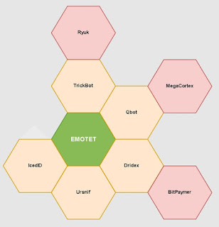 As everyone probably knows by now, the top spamming botnet since the death of Kelihos has been Emotet. Emotet is involved in the distribution of several banking trojans, including TrickBot which is known to be the main source of Ryuk ransomware infections, and Qbot, which often leads to MegaCortex ransomware, and even Dridex, which sometimes leads to BitPaymer ransomware. There are many great Emotet/Trickbot researchers out there, especially the @Cryptolaemus research group, which shares Emotet Indicators of Compromise regularly, and @pollo290987, who shared this graphic on his Twitter feed: Trickbot is ALSO distributed by other sources, which Crowdstrike does a great job of illustrating in this diagram that maps out the relationships between spambots and malware payloads: