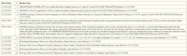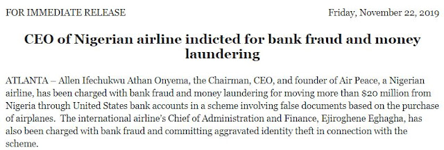 The Department of Justice announced last week that they were indicting the CEO of Air Peace for bank fraud and money laundering. I had some difficulty finding the indictments for this case on PACER. It turns out I couldn't find it in PACER because the court system decided that "Allen Ifechukwu Athan Onyema" should be listed in PACER with the last name "Athan Onyema", not "Onyema." A friend shared a copy of the indictment from Guardian.ng, which has had some interesting articles, such as this one: Why we ain’t castigating Allen Onyema, by militant group which says in part "We expect Allen Onyema to put up a good defence for himself. So far, no American bank has accused him of defrauding or absconding with its money. He is innocent until proven guilty." ... which just shows that the Joint Revolutionary Council's spokesperson also didn't read the court documents, because that is EXACTLY what he is accused of! Onyema is well-loved by many, earning wide admiration and praise for recently using his planes to repatriate many Nigerians who found themselves being shunned by xenophobia in South Africa, as was described in this BBC Pidgin article: